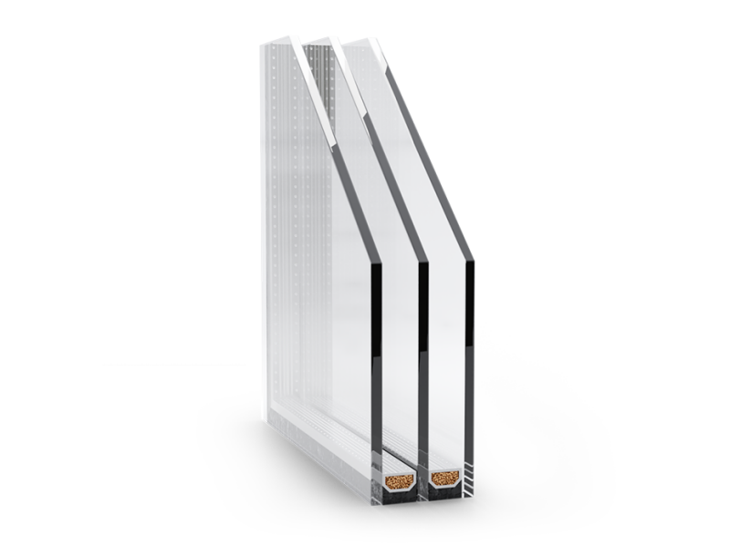 Dubbele beglazing bestaande uit drie glasbladen. Het is een norm voor raam- en deursystemen met verbeterde thermische eigenschappen.
